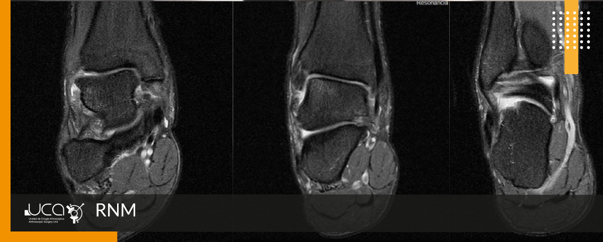 Se encuentra un edema en ángulo superoexterno de astrágalo. Lesión de ligamento PAA. Edema en subastragalina posterior, derrame tibio astragalino. Engrosamiento de ligamento deltoideo.