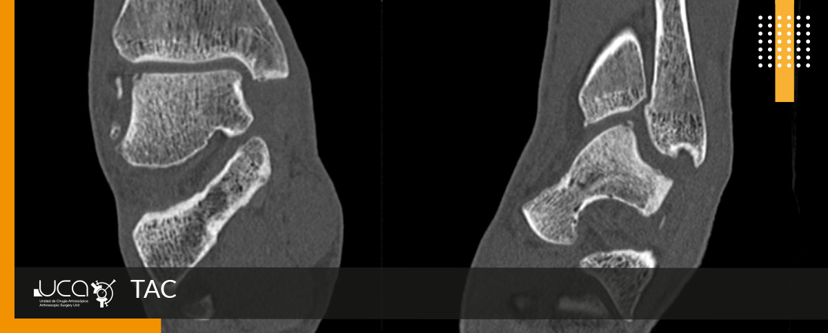 El TAC nos muestra una mínima lesión osteocondral en vertiente externa de cúpula astragalina con pequeño fragmento óseo no desplazado.