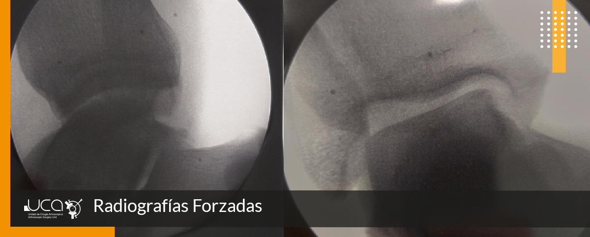 Se le realizan radiografías forzadas en las que se evidencia laxitud en varo inferior a 10º y cajón anterior +. Leve laxitud en varo sin cajón.