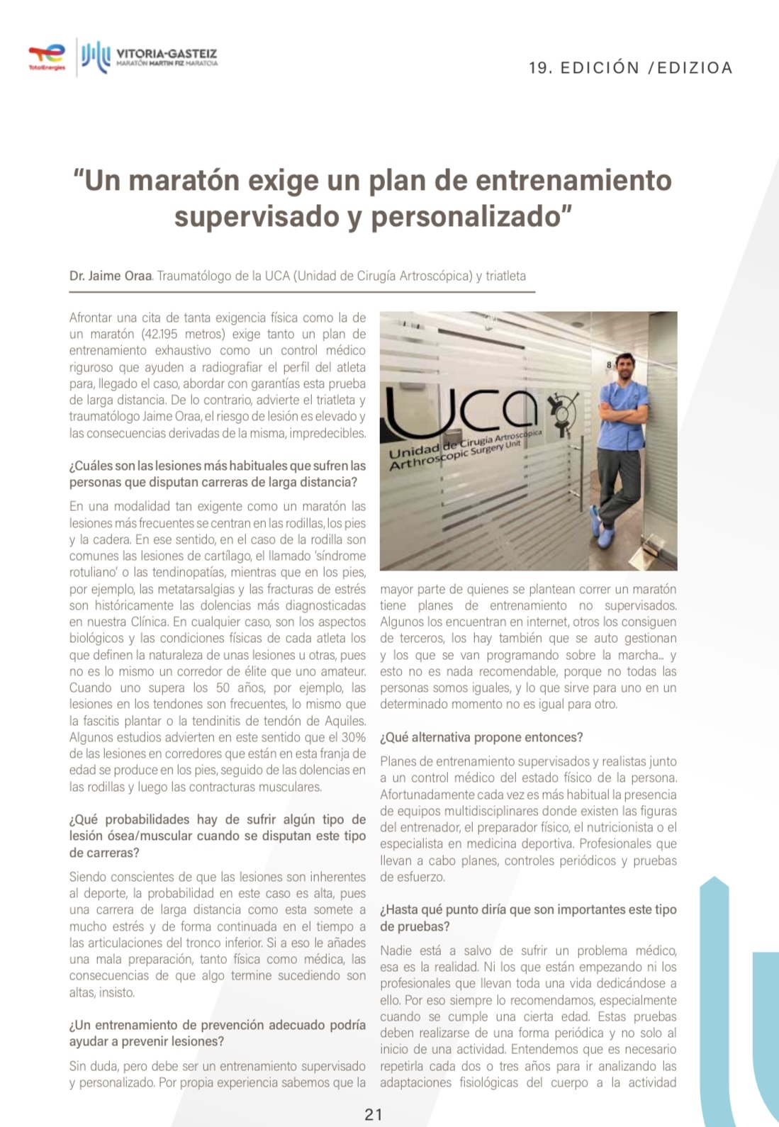 La revista oficial del Maratón Martín Fiz ha entrevistado recientemente a nuestro compañero Jaime Oraa, traumatólogo de la UCA (Unidad de Cirugía Artroscópica) y triatleta, en el marco del pasado maratón para repasar algunas claves en torno a las lesiones más habituales en carreras de larga distancia (10k, 21k, 42k...) así como pautas para prevenirlas.
