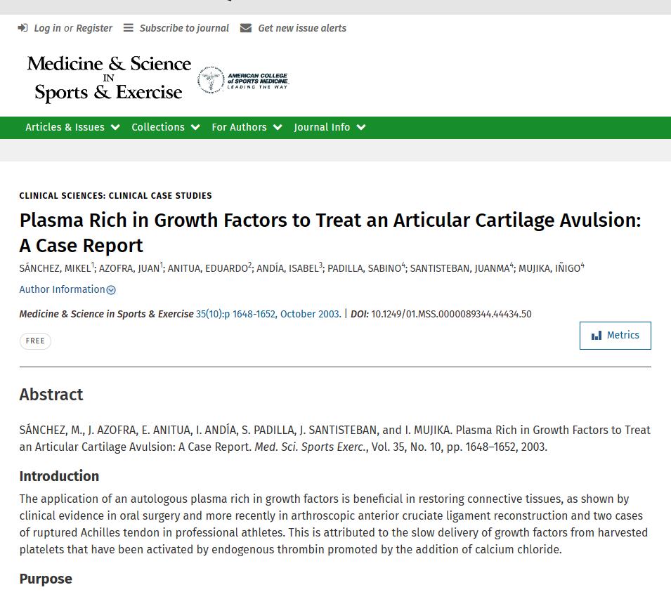 En marzo de 2003 la reputada revista científica Medicine&Science an Sports&Exercise publicó el primer artículo que planteaba el uso de PRP para el tratamiento de lesiones en el sistema musculoesquelético.