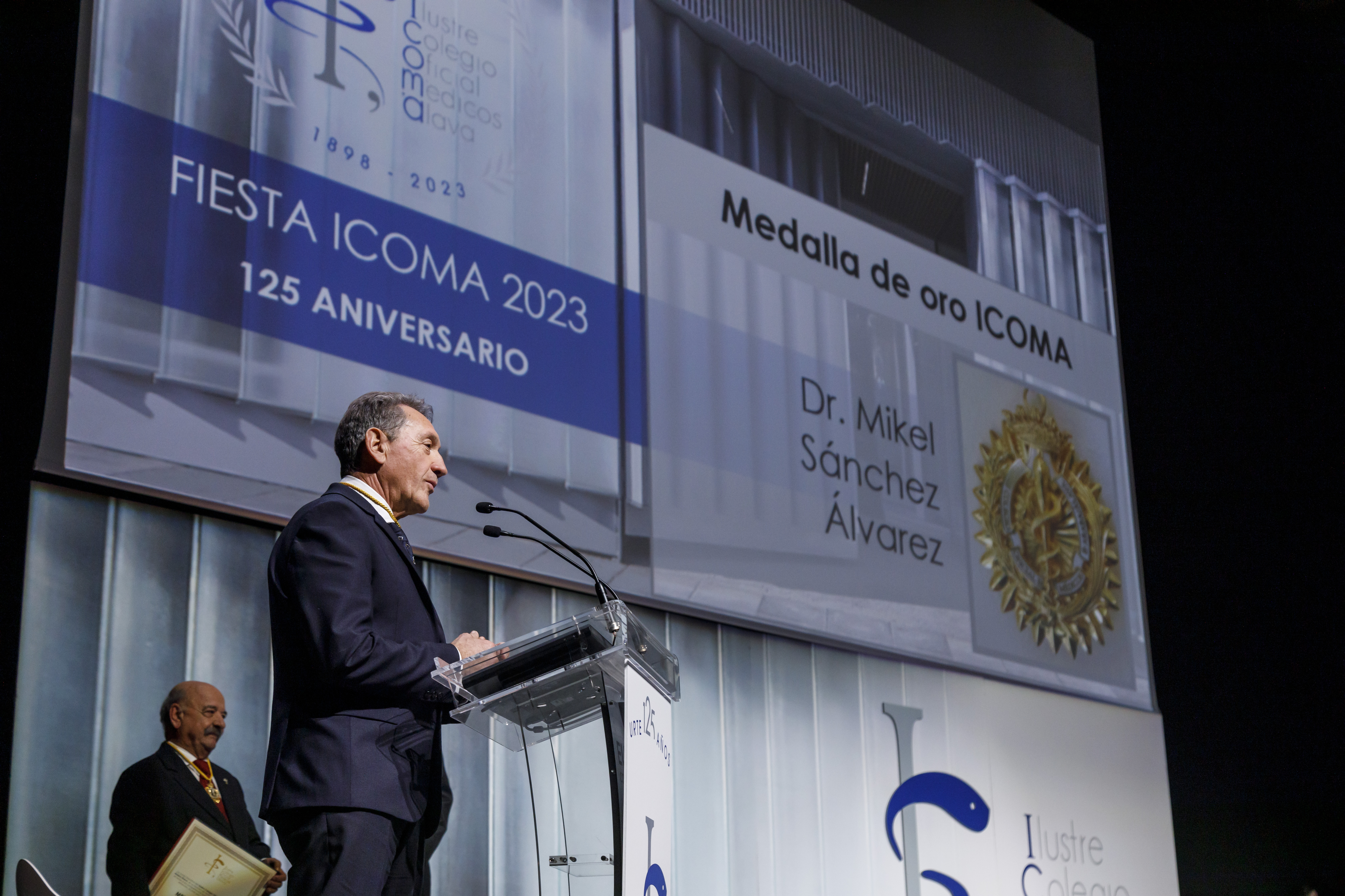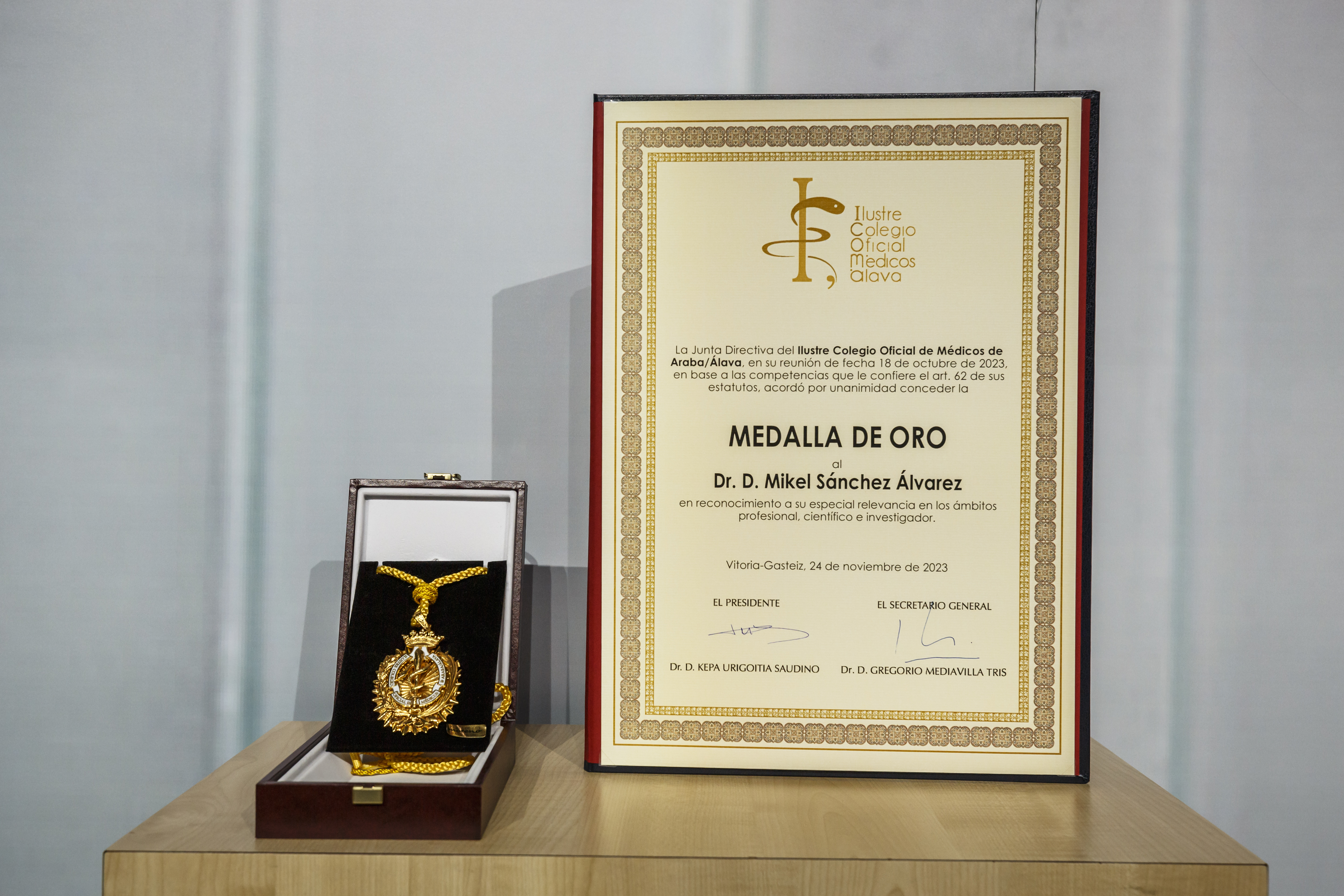 El Ilustre Colegio Oficial de Médicos de Álava (ICOMA) concedió el pasado 24 de noviembre su galardón más meritorio, la Medalla de Oro, al Doctor Mikel Sánchez por su contrastada trayectoria profesional en los ámbitos profesional, científico e investigador, y el compromiso del que siempre ha hecho gala para con el propio Colegio y los profesionales que lo integran.